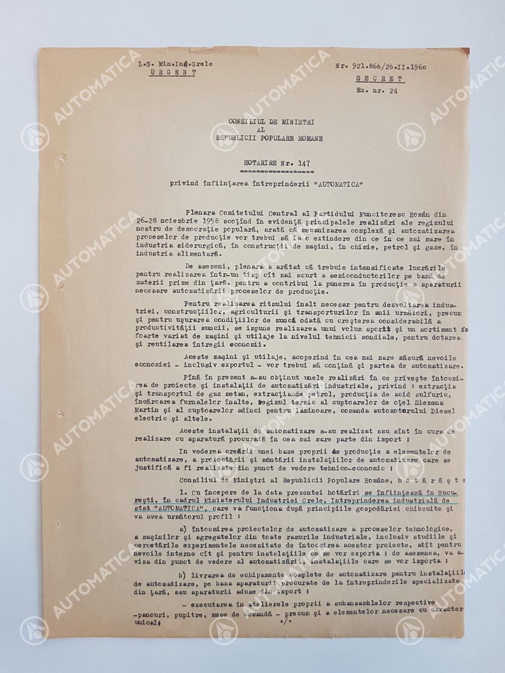 „Pentru realizarea ritmului înalt necesar pentru dezvoltarea industriei, construcțiilor, agriculturii și transporturilor în anii următori, precum și pentru ușurarea condițiilor de muncă odată cu cresșerea considerabilă a productivității muncii […], se înființează în București, în cadrul Ministerului Industriei Grele, Întreprinderea Industrială de stat Automatica”.